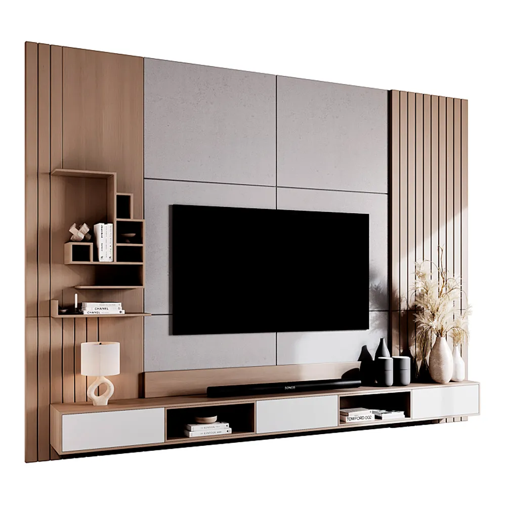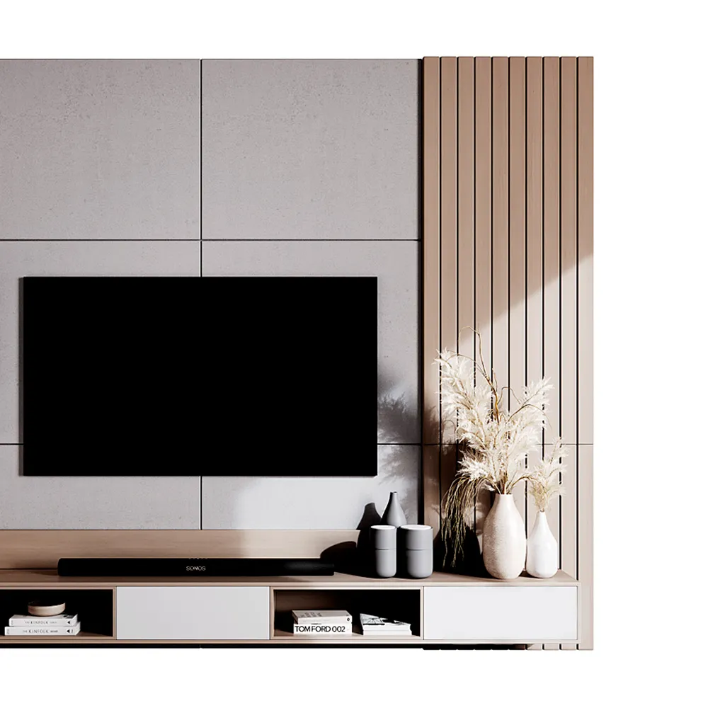 Este centro de TV moderno destaca por su diseño equilibrado y funcional. El panel central texturizado enmarca el televisor, creando un punto focal limpio. Paneles laterales de madera listonada añaden calidez y textura natural.