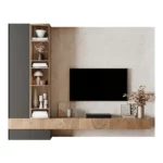 Este centro de TV irradia modernidad y elegancia minimalista. El diseño juega con contrastes sutiles entre un módulo lateral en gris antracita y una amplia base flotante de madera clara. El televisor se integra limpiamente en un panel de pared texturizado, creando un punto focal sin distracciones.