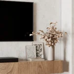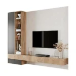 El módulo lateral combina almacenamiento cerrado y estanterías abiertas, ofreciendo tanto funcionalidad como espacio para exhibir objetos decorativos. La base flotante se extiende a lo largo de la pared, proporcionando una superficie despejada para dispositivos multimedia y elementos decorativos.