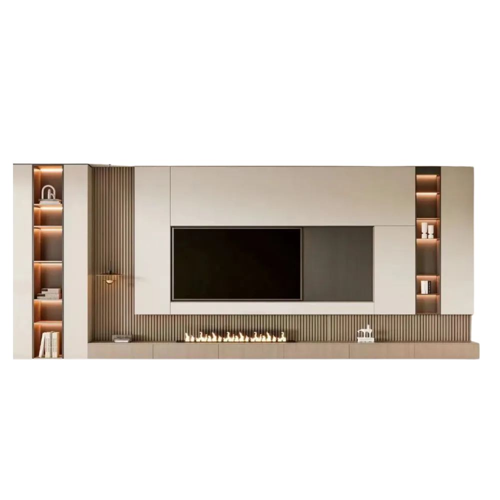 Este centro de entretenimiento presenta un diseño sofisticado y funcional, ideal para espacios contemporáneos. Su estructura integra una base con múltiples compartimentos de almacenamiento cerrados, proporcionando un aspecto ordenado y elegante. Un estante superior flotante añade una superficie adicional para la decoración o equipos electrónicos. Destaca un módulo vertical con repisas iluminadas, perfecto para exhibir objetos decorativos y libros, agregando un toque moderno y acogedor. La combinación de líneas limpias y acabados minimalistas lo convierte en una opción versátil que complementa diversos estilos de interiores.