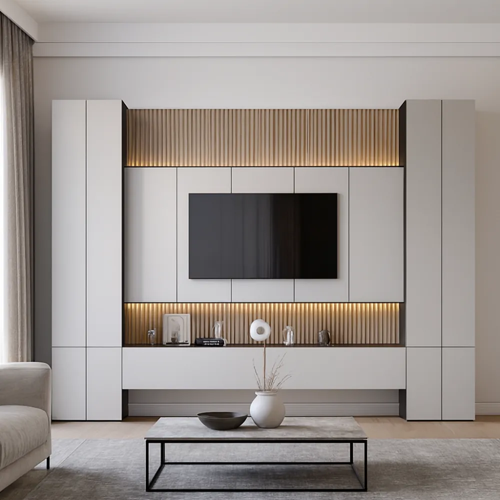 Este centro de TV moderno destaca por su diseño simétrico y funcional. El panel central neutro enmarca el televisor, creando un punto focal definido. Paneles listonados añaden textura y modernidad.