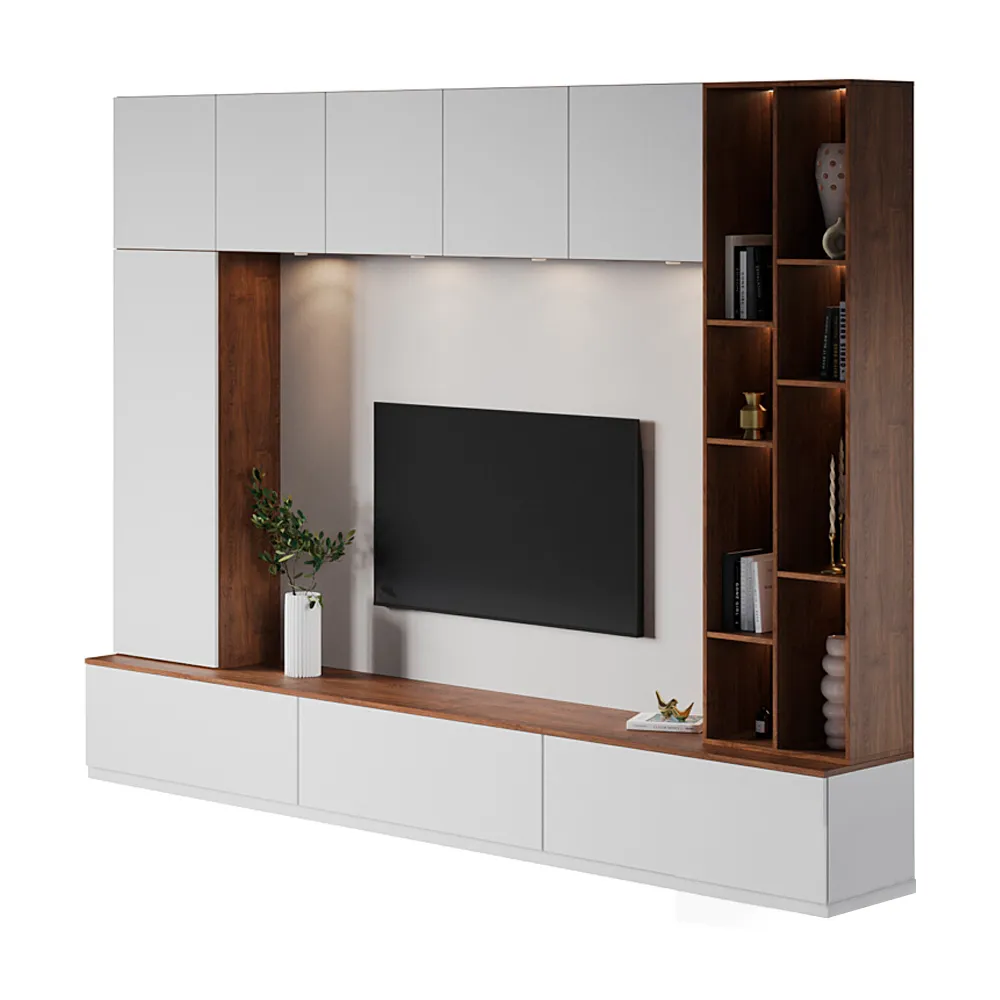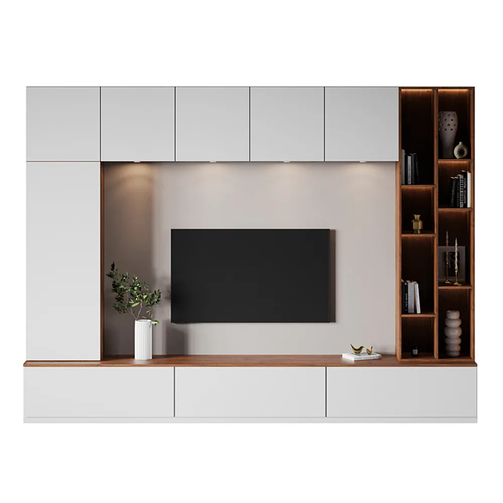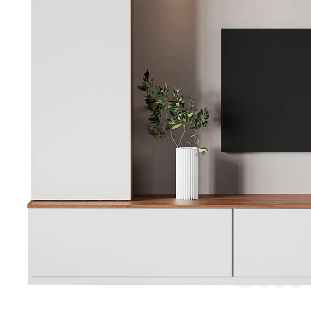 Este centro de TV moderno y minimalista destaca por su diseño funcional y elegante. La combinación de gabinetes blancos mate y detalles en madera oscura crea un contraste visual atractivo, ideal para espacios contemporáneos.