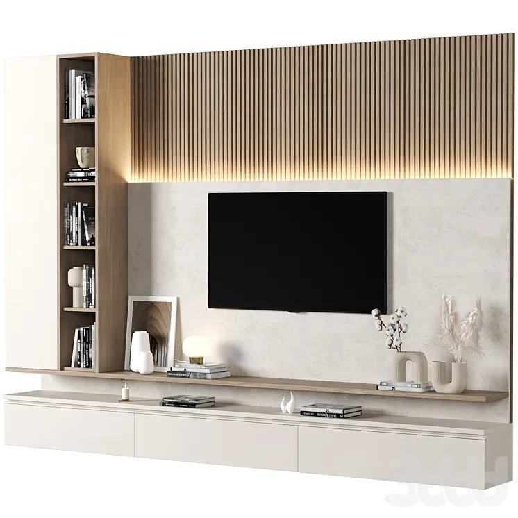 Este centro de TV moderno combina funcionalidad y estética en un diseño equilibrado. El panel central neutro y texturizado enmarca el televisor, creando un punto focal definido. Un panel listonado añade textura y modernidad.
