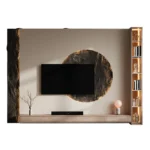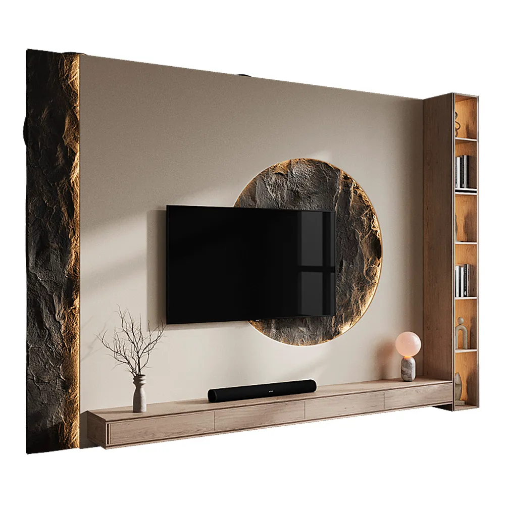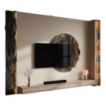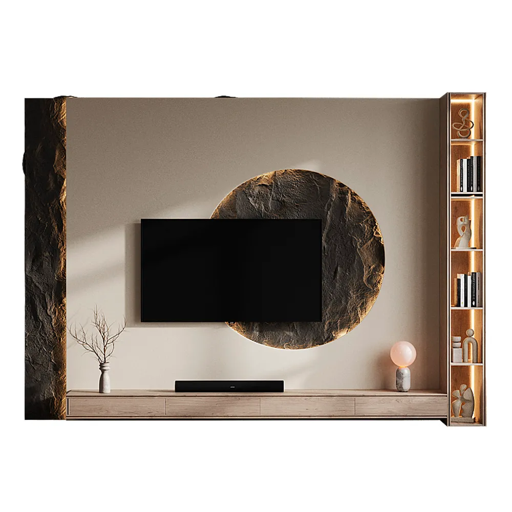 Este centro de TV irradia una elegancia rústica y moderna, combinando texturas naturales y líneas limpias. El panel de pared en tonos neutros sirve como telón de fondo para un diseño único y atractivo. Un círculo central texturizado, con un acabado que imita la piedra, enmarca el televisor, creando un punto focal dramático.