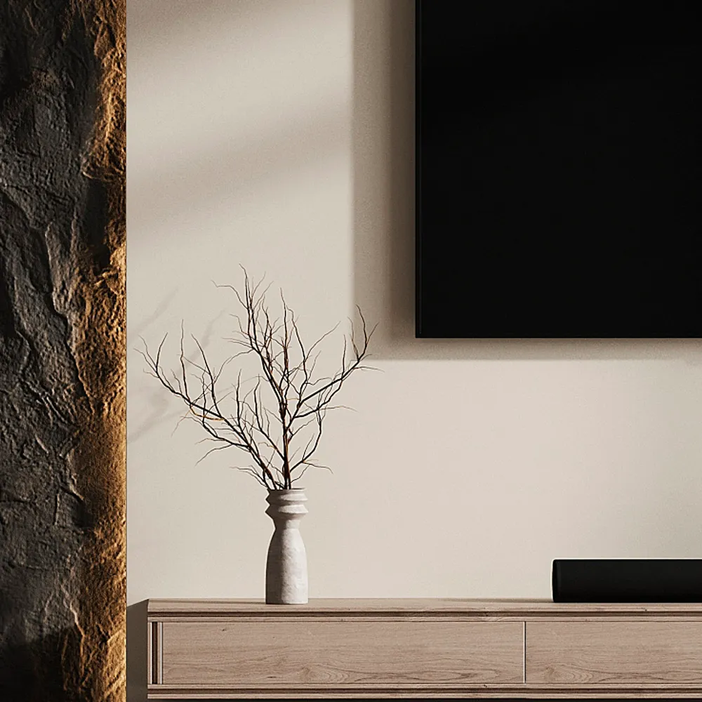 La base flotante se extiende a lo largo de la pared, ofreciendo espacio para dispositivos multimedia y decoración. Los gabinetes inferiores proporcionan almacenamiento oculto, manteniendo el espacio ordenado. La iluminación tenue resalta las texturas y los detalles del mueble, creando un ambiente cálido y acogedor. Este centro de TV es ideal para salones modernos que buscan un diseño distintivo y sofisticado.