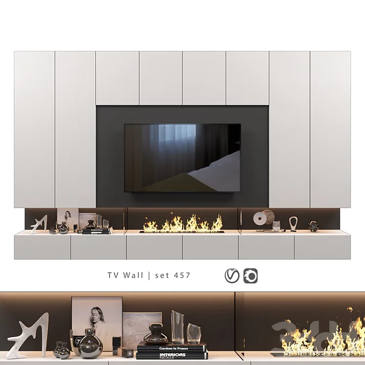 Este centro de TV moderno combina funcionalidad y estética en un diseño equilibrado. El panel central neutro enmarca el televisor, creando un punto focal definido. Módulos laterales ofrecen almacenamiento adicional.