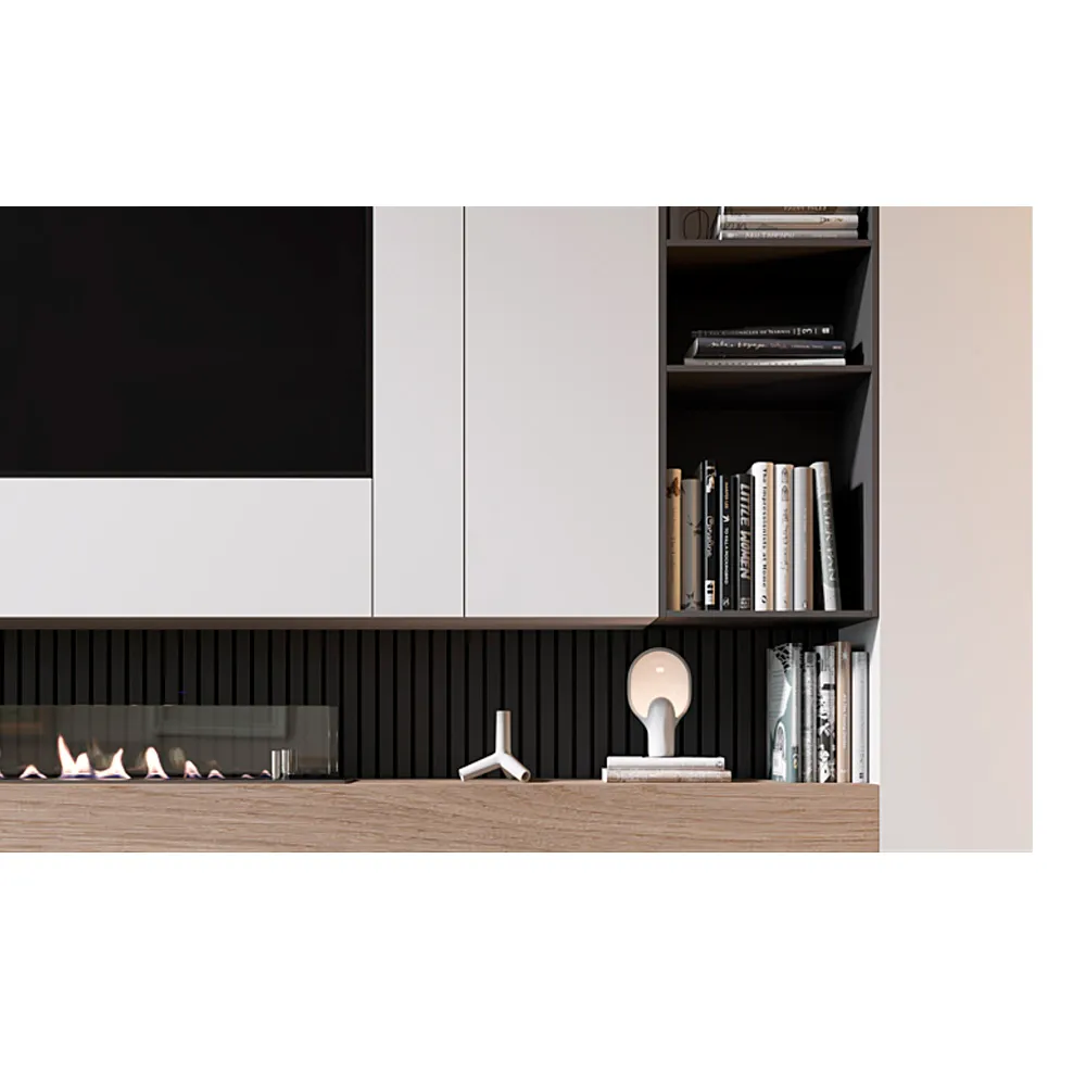 Diseño Integrado y Personalizable: Una solución de almacenamiento a medida que se adapta perfectamente a tu pared, combinando módulos cerrados y estanterías abiertas iluminadas. Olvídate del desorden y organiza tus dispositivos y objetos decorativos de forma discreta y elegante.