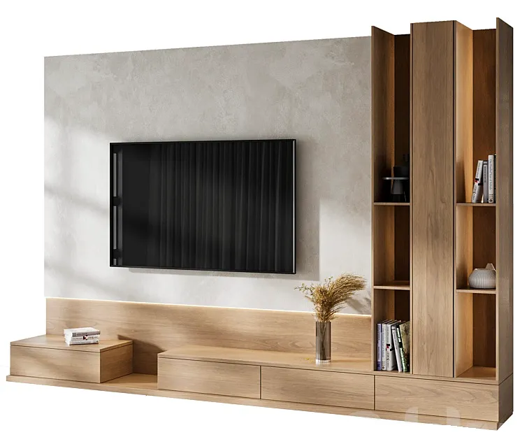Este centro de entretenimiento presenta un diseño sofisticado y funcional, ideal para espacios contemporáneos. Su estructura integra una base con múltiples compartimentos de almacenamiento cerrados, proporcionando un aspecto ordenado y elegante. Un estante superior flotante añade una superficie adicional para la decoración o equipos electrónicos. Destaca un módulo vertical con repisas iluminadas, perfecto para exhibir objetos decorativos y libros, agregando un toque moderno y acogedor. La combinación de líneas limpias y acabados minimalistas lo convierte en una opción versátil que complementa diversos estilos de interiores.