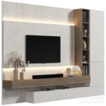Este centro de entretenimiento presenta un diseño sofisticado y funcional, ideal para espacios contemporáneos. Su estructura integra una base con múltiples compartimentos de almacenamiento cerrados, proporcionando un aspecto ordenado y elegante. Un estante superior flotante añade una superficie adicional para la decoración o equipos electrónicos. Destaca un módulo vertical con repisas iluminadas, perfecto para exhibir objetos decorativos y libros, agregando un toque moderno y acogedor. La combinación de líneas limpias y acabados minimalistas lo convierte en una opción versátil que complementa diversos estilos de interiores.