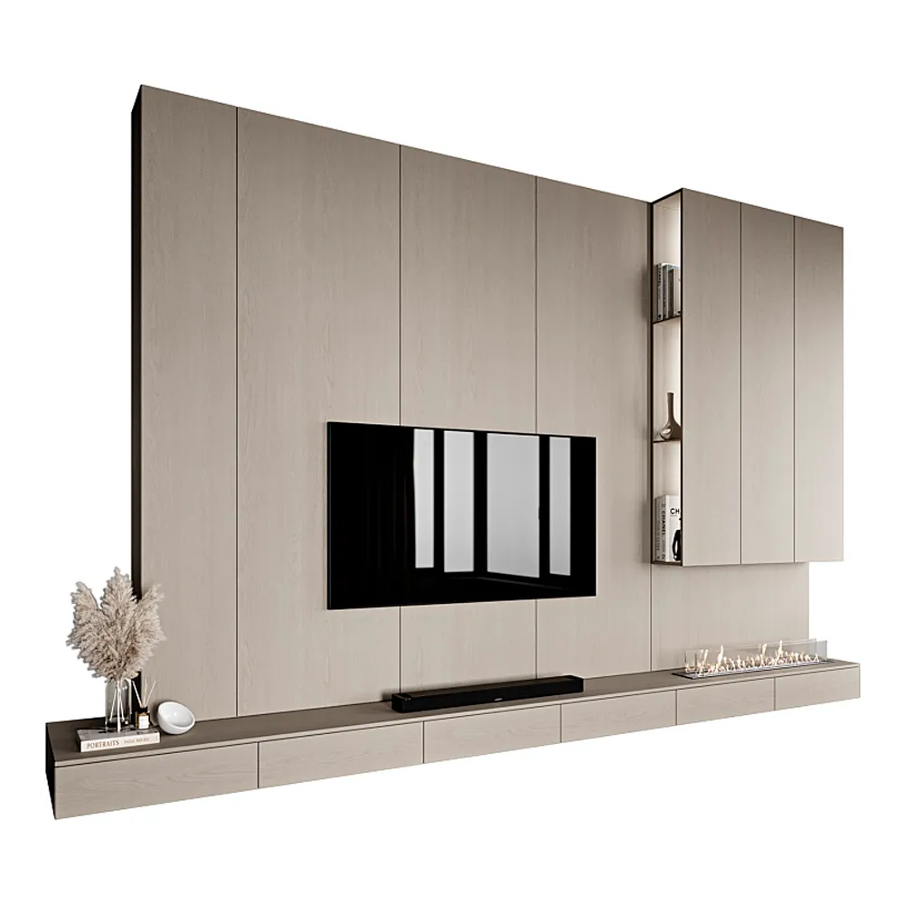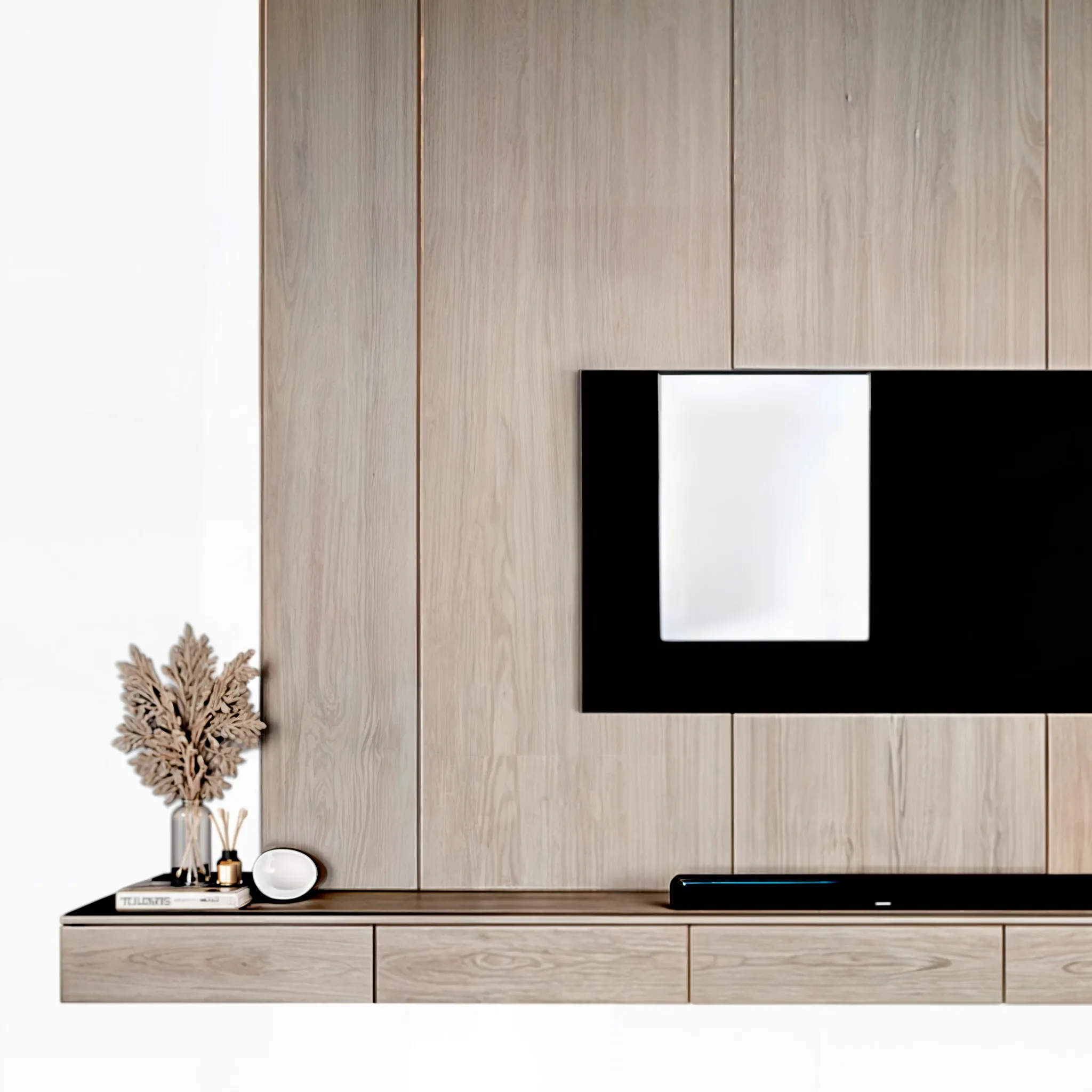 Este centro de TV minimalista destaca por su diseño elegante y funcional. El panel de pared en tonos neutros, con líneas verticales sutiles, crea un fondo sofisticado y limpio. El televisor se integra perfectamente en este panel, siendo el foco central.