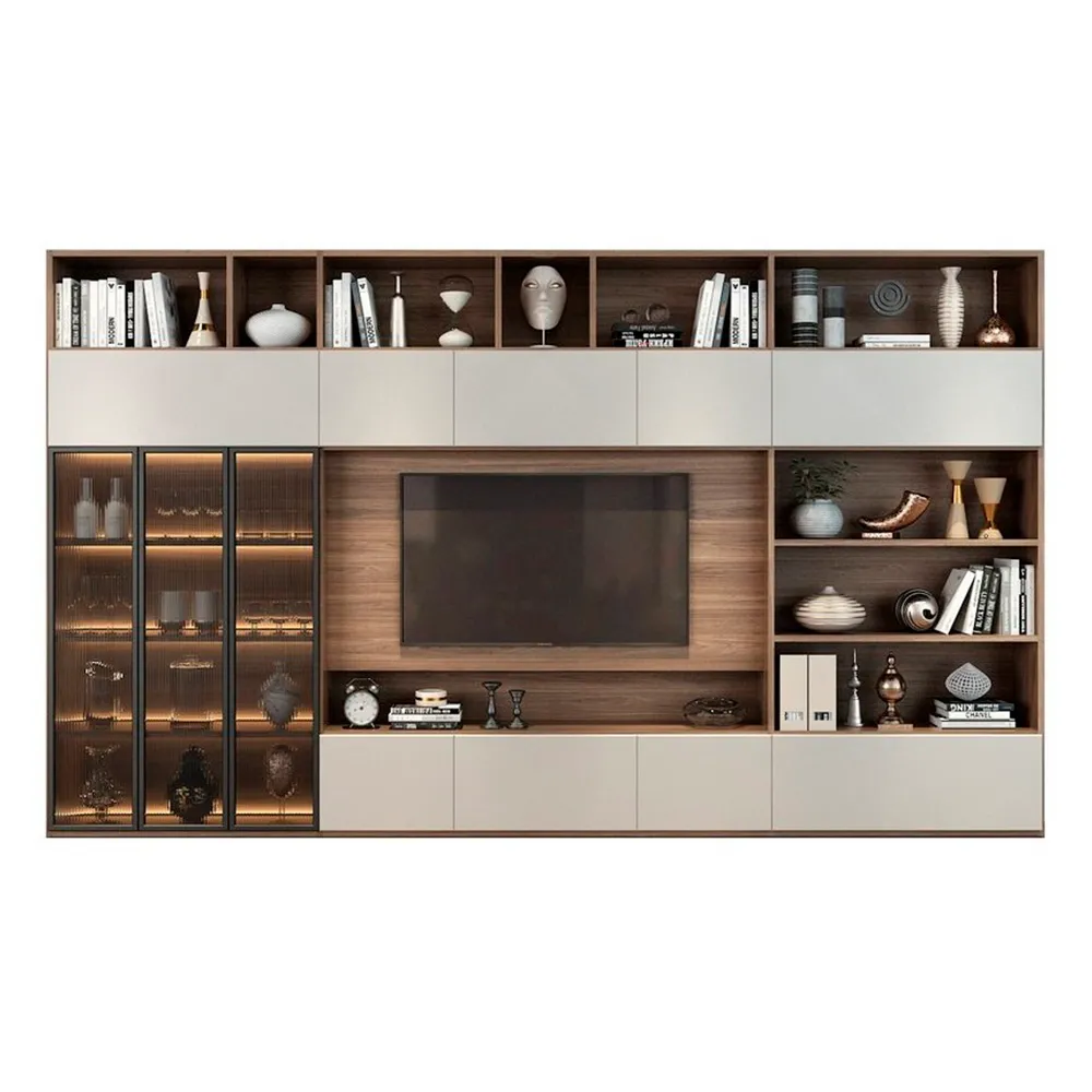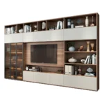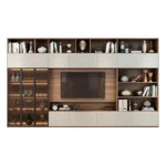 Este centro de entretenimiento destaca por su diseño sofisticado y versátil, ideal para quienes buscan combinar almacenamiento y estilo en un solo elemento. La estructura incorpora espacios abiertos y cerrados que permiten organizar libros, decoraciones y objetos personales de manera ordenada. La iluminación interna en la vitrina de vidrio resalta la elegancia de los elementos exhibidos, aportando un toque de lujo. Los acabados en tonos neutros y madera generan una atmósfera cálida y armoniosa, integrándose fácilmente en diversos estilos de decoración.