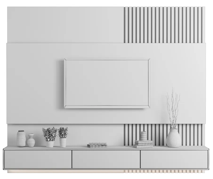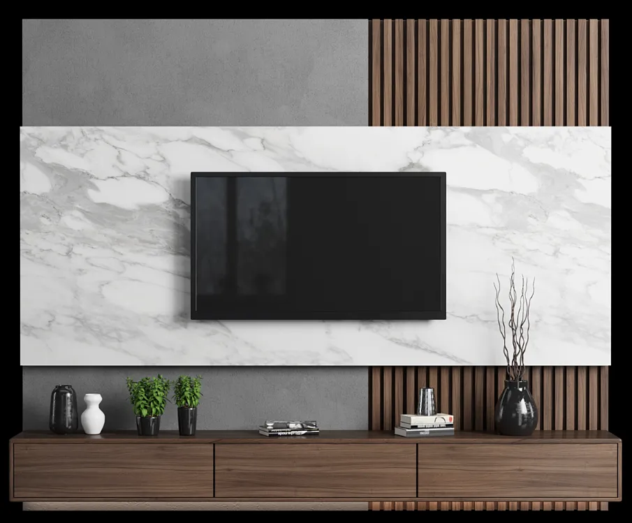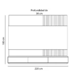 Centro de entretenimiento de Tv hecho en base a melamina de 18 mm de espesor con canto delgado en la estructura, canto grueso de 3 mm en las puertas y tablero principal. Puertas con sistema Push Open y bisagras cangrejo.