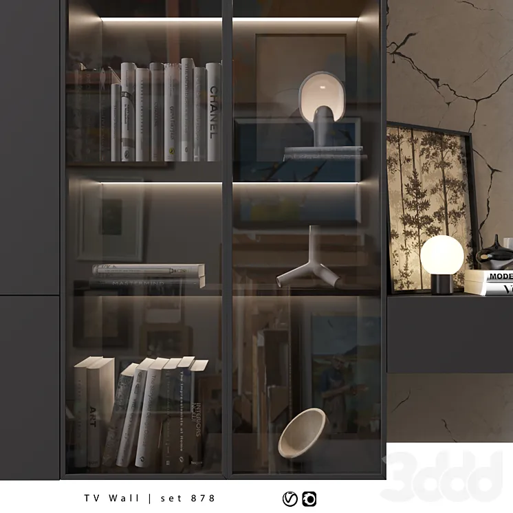 Un módulo vertical con estantes y gabinetes ofrece espacio decorativo y almacenamiento oculto. La base se extiende, proporcionando espacio para dispositivos y decoración. La iluminación tenue resalta los detalles. Ideal para salones modernos que buscan diseño y funcionalidad.