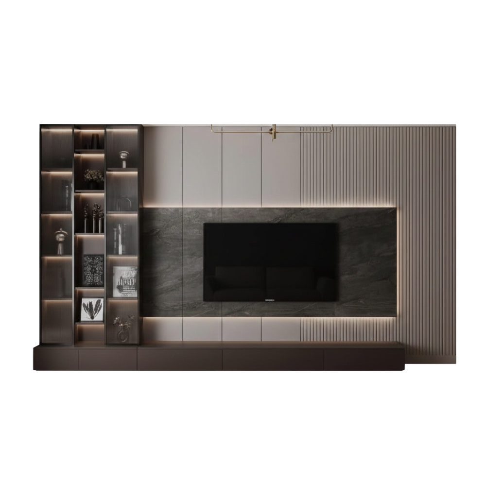 Diseño Integrado a Medida: Una solución de pared que maximiza el espacio con un mueble de TV flotante y estanterías incorporadas, ofreciendo un aspecto fluido y ordenado.