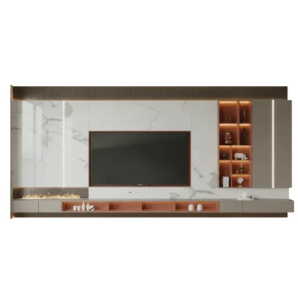 Mueble de entretenimiento de Tv de melamina de 18 mm de espesor con canto delgado en la estructura y canto grueso de 3 mm en las puertas y tablero principal. Puertas con sistema Push Open y bisagras cangrejo. Es perfecto para quienes buscan un equilibrio entre almacenamiento funcional y un toque decorativo en su sala de estar.