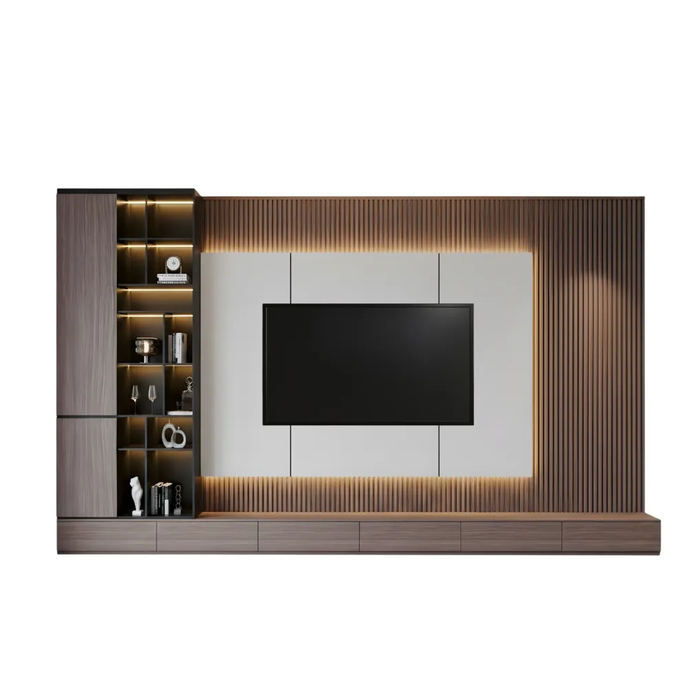 Diseñado para televisores de gran tamaño, este conjunto no solo es visualmente impresionante, sino también altamente funcional. Cuenta con amplias estanterías abiertas iluminadas y gabinetes cerrados para ofrecer una solución de almacenamiento elegante y discreta para tus dispositivos multimedia, libros y decoración.