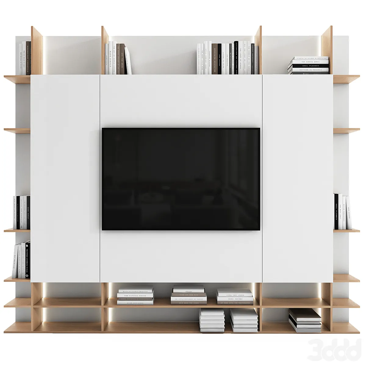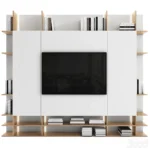 Este centro de TV moderno destaca por su diseño modular y minimalista, ideal para espacios contemporáneos. El mueble presenta una estructura simétrica con paneles centrales blancos que enmarcan el televisor, creando un punto focal definido. Estantes abiertos en tonos neutros rodean los paneles centrales, ofreciendo espacio para libros y objetos decorativos.