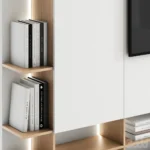 La combinación de paneles cerrados y estantes abiertos crea un diseño equilibrado y funcional. La iluminación tenue resalta los detalles del diseño, creando un ambiente cálido y acogedor. Este centro de TV es ideal para salones modernos que buscan un diseño funcional y estético.