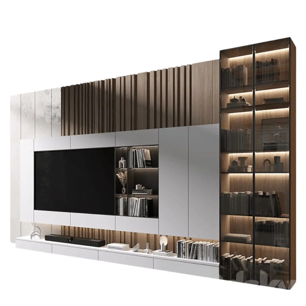 Este centro de entretenimiento combina modernidad y elegancia con una estructura en tonos neutros y detalles en madera. Su diseño integra paneles lisos y secciones con textura lineal, aportando dinamismo visual. Un amplio gabinete con puertas cerradas brinda almacenamiento discreto, mientras que un módulo con vitrinas de vidrio e iluminación LED resalta la exhibición de libros y objetos decorativos. La base baja ofrece espacio para dispositivos electrónicos y elementos decorativos, creando un ambiente sofisticado y funcional para cualquier sala de estar.