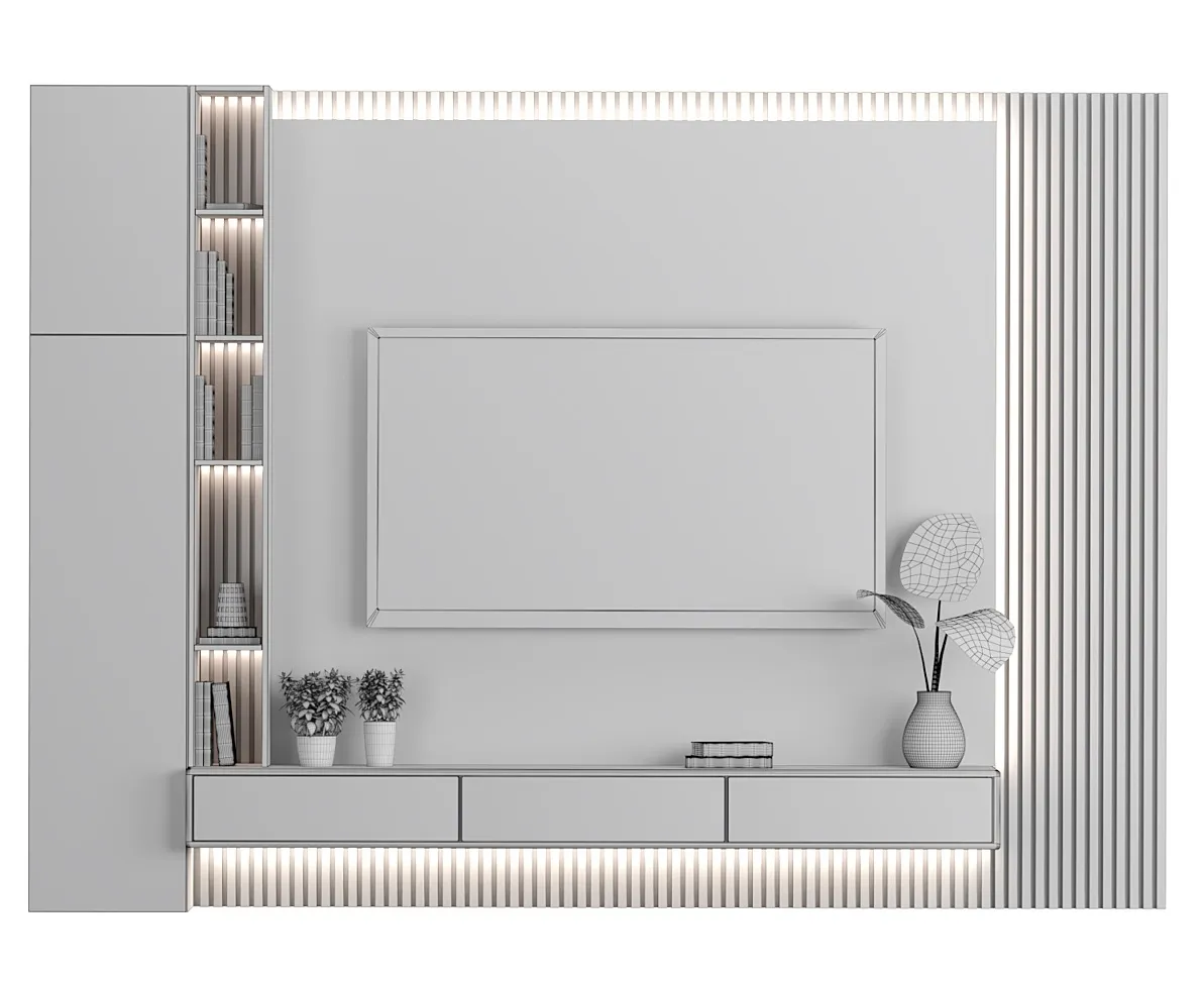 Diseño Integrado a Medida: Una solución de pared que maximiza el espacio con un mueble de TV flotante y estanterías incorporadas, ofreciendo un aspecto fluido y ordenado.