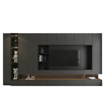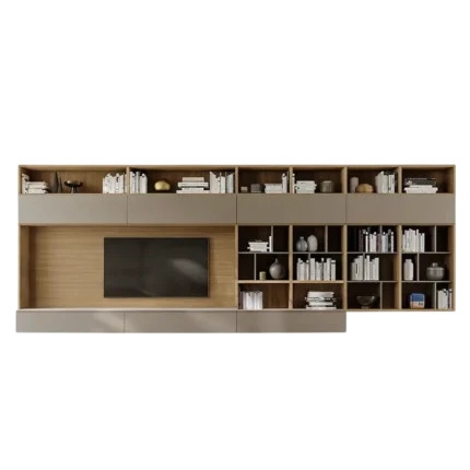 Mueble de entretenimiento de Tv de melamina de 18 mm de espesor con canto delgado en la estructura y canto grueso de 3 mm en las puertas y tablero principal. Puertas con sistema Push Open y bisagras cangrejo. Su diseño minimalista en tonos beige y madera lo convierte en una opción ideal para ambientes modernos y acogedores.