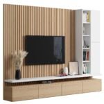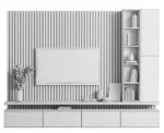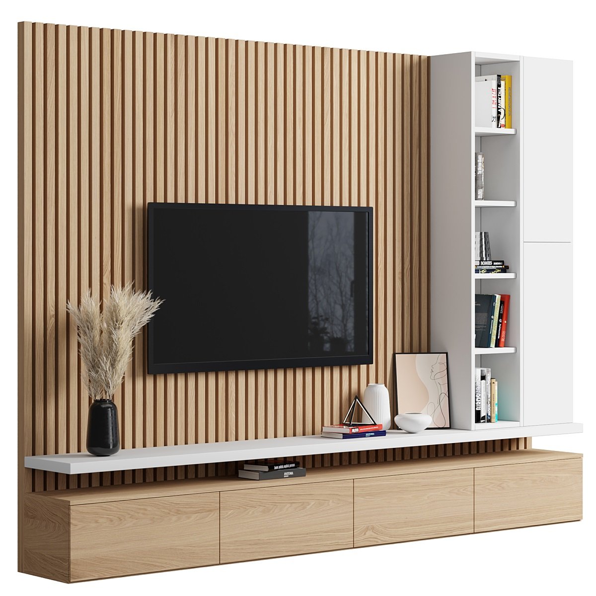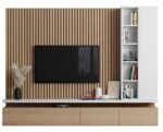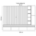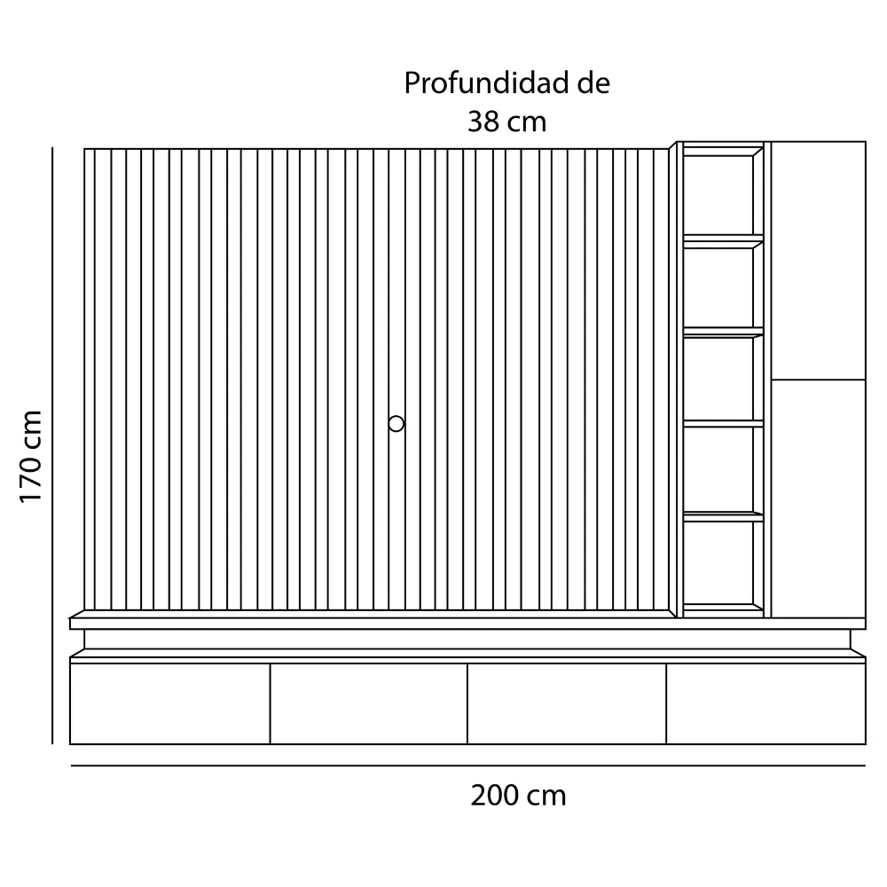 Mueble de entretenimiento de Tv de melamina de 18 mm de espesor con canto delgado en la estructura y canto grueso de 3 mm en las puertas y tablero principal. Puertas con sistema Push Open y bisagras cangrejo.
