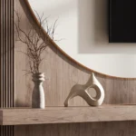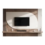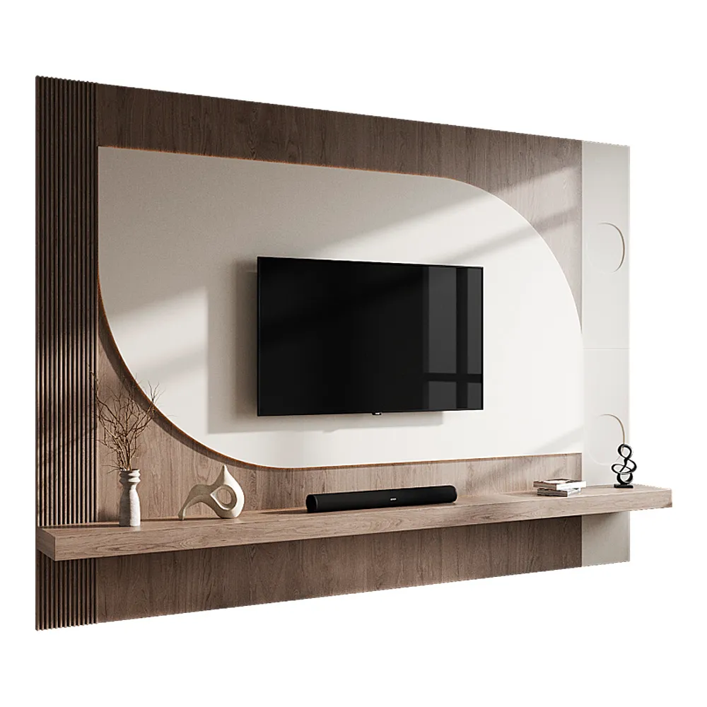 Este centro de TV moderno destaca por su diseño orgánico y funcional. El panel de pared, con una forma curva distintiva, enmarca el televisor, creando un punto focal único. Los paneles laterales listonados añaden textura y un toque contemporáneo.