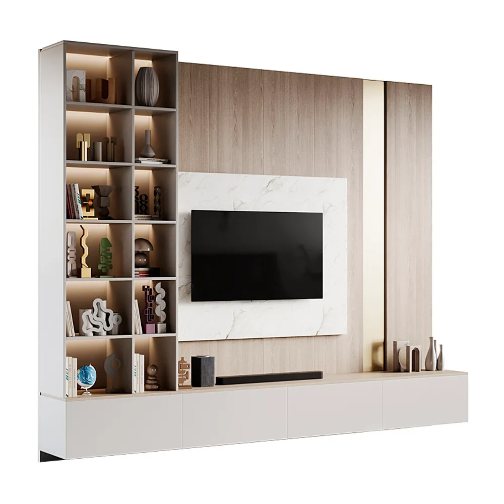 Este centro de TV moderno destaca por su diseño equilibrado y funcional. El panel central, imitando mármol, enmarca el televisor, creando un punto focal definido. Paneles texturizados a los lados añaden profundidad y modernidad.