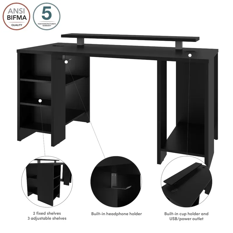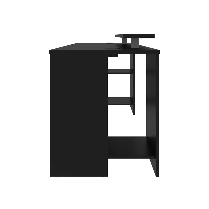 ¡El escritorio para juegos ha sido diseñado pensando en los jugadores! Tiene todo lo que un jugador activo podría necesitar. Cuenta con un estante superior grande lo suficientemente grande para dos monitores grandes y un escritorio ergonómico de tamaño generoso debajo, adecuado para el teclado, el mouse, los controladores, los juegos y más. La base del escritorio cuenta con un compartimento para computadora con un orificio de ventilación y un pequeño estante para juegos o controladores. Este escritorio para computadora para juegos de aspecto moderno tiene un acabado en negro, lo que lo convierte en una incorporación sorprendente para cualquier hogar u oficina.