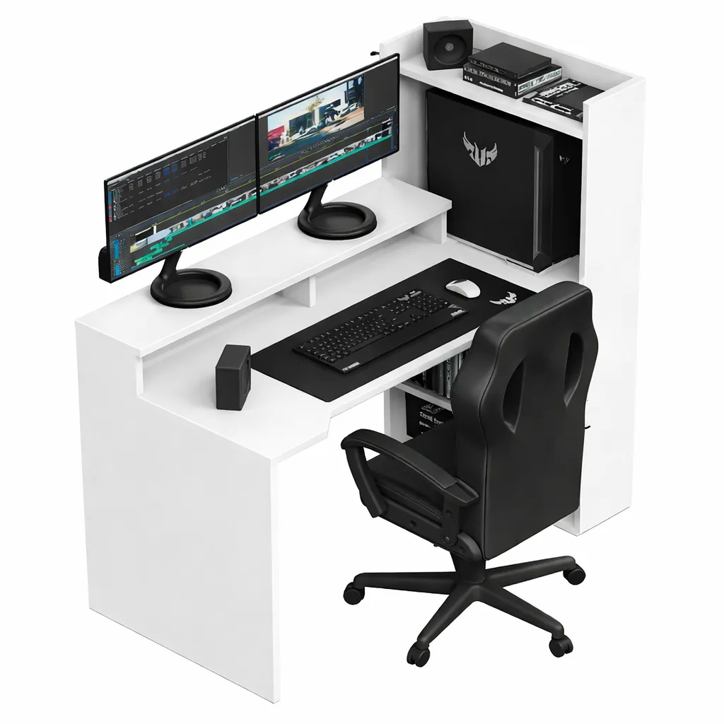 ¡El escritorio para juegos ha sido diseñado pensando en los jugadores! Tiene todo lo que un jugador activo podría necesitar. Cuenta con un estante superior grande lo suficientemente grande para dos monitores grandes y un escritorio ergonómico de tamaño generoso debajo, adecuado para el teclado, el mouse, los controladores, los juegos y más. La base del escritorio cuenta con un compartimento para computadora con un orificio de ventilación y un pequeño estante para juegos o controladores. Este escritorio para computadora para juegos de aspecto moderno tiene un acabado en blanco, lo que lo convierte en una incorporación sorprendente para cualquier hogar u oficina.