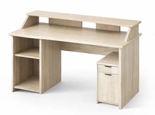 Hay una variedad de prácticas opciones de almacenamiento debajo del escritorio, que incluyen un cajón extraíble y un armario grande.