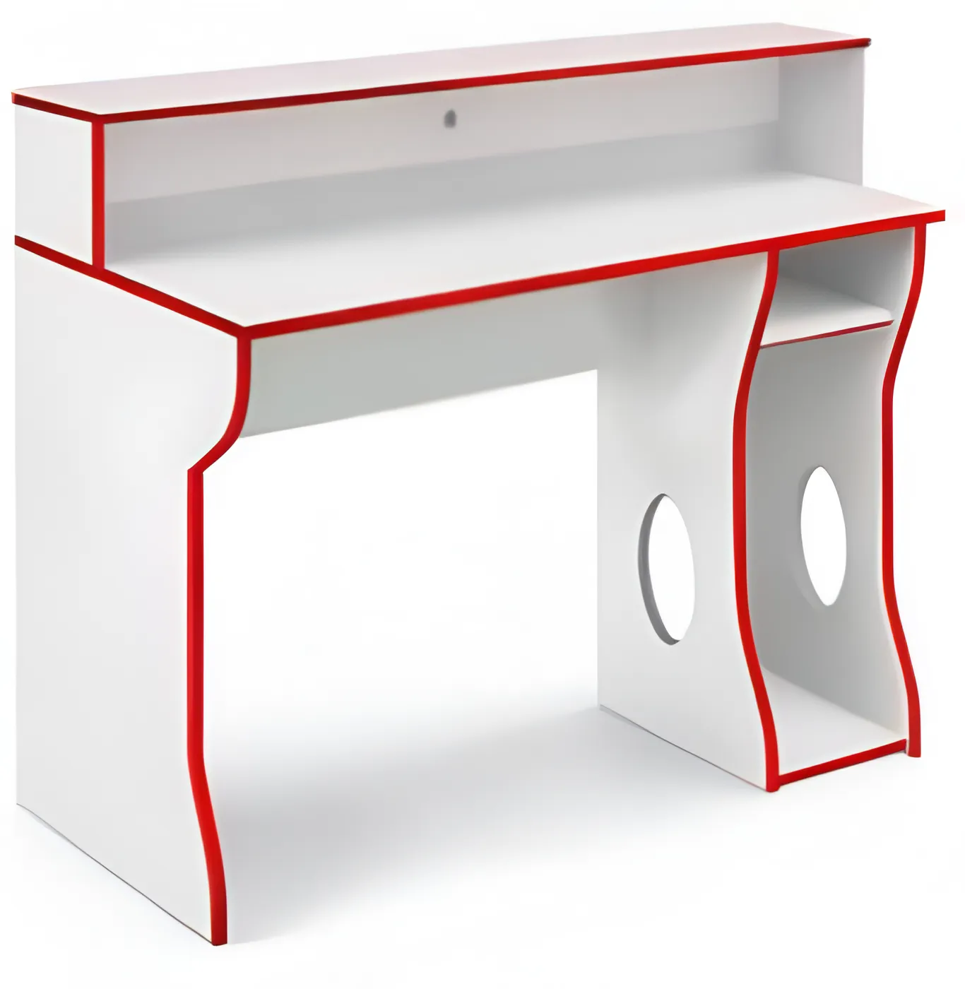 La base del escritorio cuenta con un compartimento para computadora con un orificio de ventilación y un pequeño estante para juegos o controladores. Este escritorio para computadora para juegos de aspecto moderno tiene un acabado en blanco con un borde rojo oscuro, lo que lo convierte en una incorporación sorprendente para cualquier hogar u oficina.