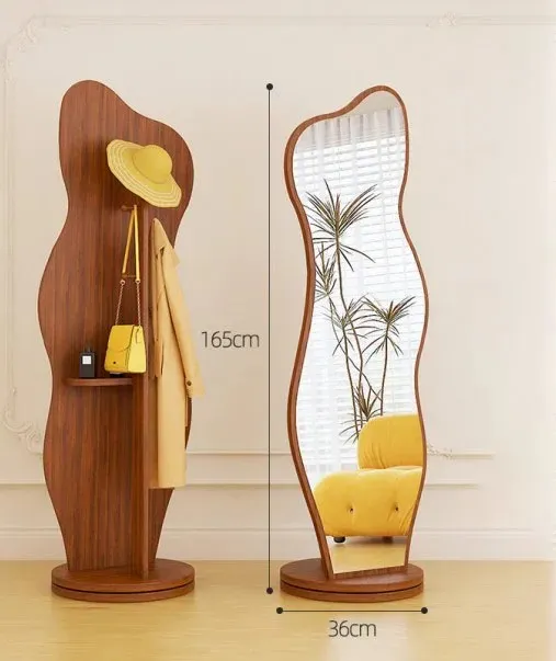 Eleva tu espacio con la combinación perfecta de diseño y practicidad. Este espejo de cuerpo completo no es solo un accesorio de decoración; es una solución de almacenamiento 2 en 1 que transformará tu dormitorio, vestidor o recibidor. Su diseño moderno con curvas suaves y marco de madera aporta un toque único y artístico a cualquier rincón. Gracias a su base giratoria de 360 grados, puedes ver tu outfit completo y, con un simple giro, acceder al práctico perchero y estante integrados. Mantén tu ropa, bolsos, sombreros y accesorios organizados y siempre a mano.