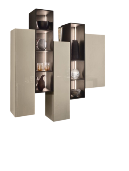 Este sistema de estanterías y vitrinas de pared exhibe un diseño modular y contemporáneo con una composición asimétrica y dinámica. Se compone de vitrinas verticales con estructura oscura y puertas de vidrio iluminadas interiormente para exhibir objetos decorativos en estantes de vidrio, flanqueadas por módulos de almacenamiento cerrados con puertas lisas de color claro y acabado brillante. La disposición escalonada y desalineada de los elementos suspendidos a diferentes alturas crea un efecto visual moderno y minimalista, optimizando el espacio al estar anclado directamente a la pared.