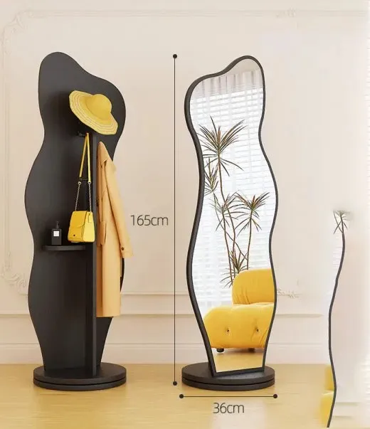 Eleva tu espacio con la combinación perfecta de diseño y practicidad. Este espejo de cuerpo completo no es solo un accesorio de decoración; es una solución de almacenamiento 2 en 1 que transformará tu dormitorio, vestidor o recibidor. Su diseño moderno con curvas suaves y marco de madera aporta un toque único y artístico a cualquier rincón. Gracias a su base giratoria de 360 grados, puedes ver tu outfit completo y, con un simple giro, acceder al práctico perchero y estante integrados. Mantén tu ropa, bolsos, sombreros y accesorios organizados y siempre a mano.