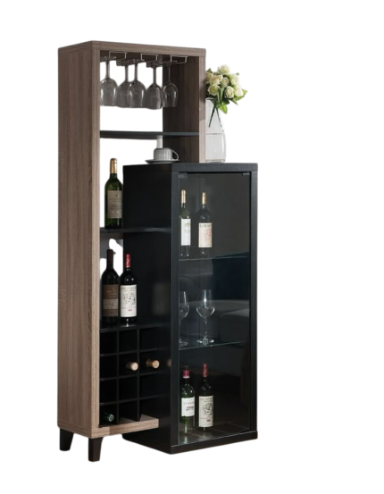 Este mueble bar vertical de diseño moderno y funcional combina almacenamiento abierto y cerrado para organizar elementos de bar. A la izquierda, una estructura de madera clara ofrece un riel superior para copas, estantes para botellas de licor de diversas alturas y un botellero con divisiones para almacenamiento horizontal. A la derecha, una sección más estrecha con marco negro y puerta de vidrio exhibe botellas de vino y copas en estantes interiores, con un fondo oscuro que resalta su contenido. La parte superior del mueble sirve como superficie de apoyo, y el conjunto se eleva ligeramente sobre pequeñas patas negras, optimizando el espacio con una estética contemporánea.