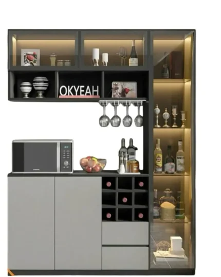 Este mueble bar moderno de color gris y blanco ofrece diversas soluciones de almacenamiento y exhibición. En la parte superior, cuenta con armarios con puertas de vidrio y luz interior, ideales para mostrar botellas y cristalería. Una repisa abierta central permite colocar elementos decorativos, mientras que un riel metálico inferior sostiene copas de vino suspendidas.