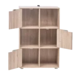 Estante decorativo a base de melamina de 18 mm de espesor con canto delgado en la estructura y canto grueso de 3 mm. Estante pequeño de seis compartimentos con puertas, ideal para espacios reducidos y con un estilo funcional.
