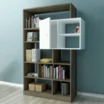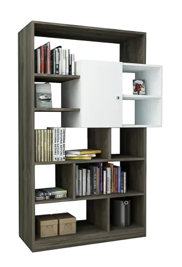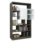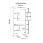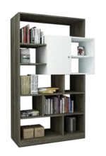 Estante decorativo a base de melamina de 18 mm de espesor con canto delgado en la estructura y canto grueso de 3 mm. Combina madera oscura y blanco, ofreciendo almacenamiento práctico y decorativo en un diseño escandinavo.