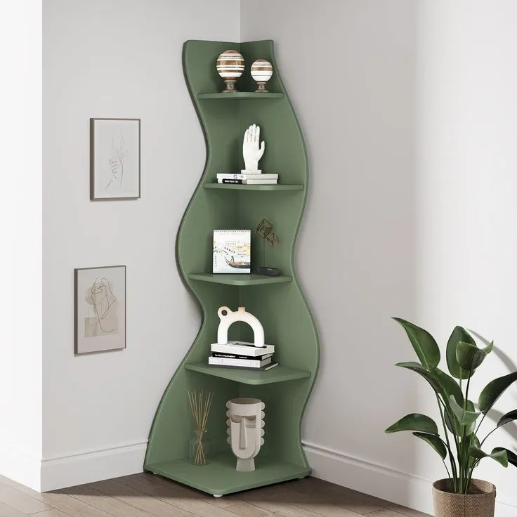 Este es un estante esquinero de diseño moderno y escultural. Está construido con una forma sinuosa y ondulada en un tono verde oliva o salvia, lo que le da un aspecto orgánico y distintivo. Los estantes, integrados en la forma curva, son semicirculares y ofrecen varios niveles para exhibir objetos decorativos, libros u otros artículos. Su diseño aprovecha el espacio de la esquina de una manera llamativa, funcionando no solo como almacenamiento sino también como una pieza de arte funcional. Los objetos colocados en los estantes resaltan su capacidad para complementar una decoración contemporánea y artística.