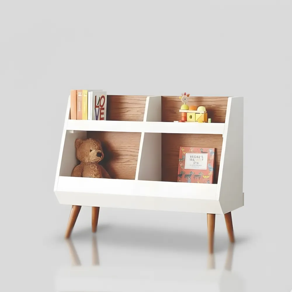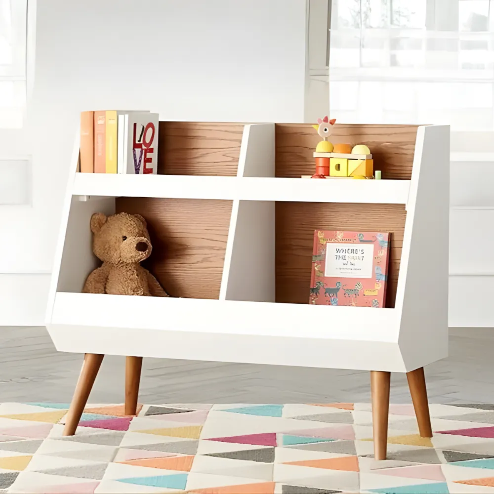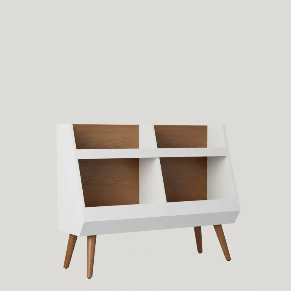 Este mueble diseñado para la organización y exhibición de objetos en espacios infantiles. Presenta una estructura que permiten a los niños acceder fácilmente a sus libros y juguetes, fomentando su autonomía y el orden.