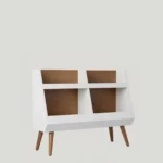 La estantería cuenta con patas de madera clara, que le dan un aspecto ligero y elegante. El tamaño compacto de la estantería la hace perfecta para espacios pequeños, proporcionando un lugar práctico para guardar objetos personales y otros elementos esenciales.