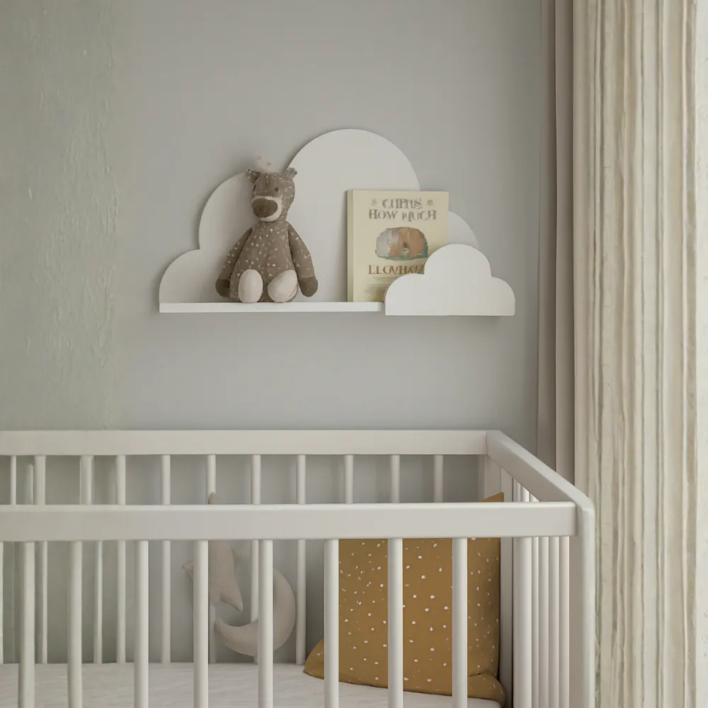 La repisa ofrece espacio para almacenar libros, juguetes y otros objetos decorativos, fomentando la organización y la creatividad en los niños. Su diseño flotante y sus formas suaves añaden un toque mágico y onírico a la habitación infantil.