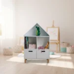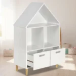 Este mueble diseñado para la organización y exhibición de objetos en espacios infantiles. Presenta una estructura en forma de casa de tamaño pequeño que permiten a los niños acceder fácilmente a sus libros y juguetes, fomentando su autonomía y el orden.