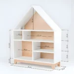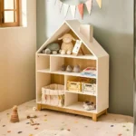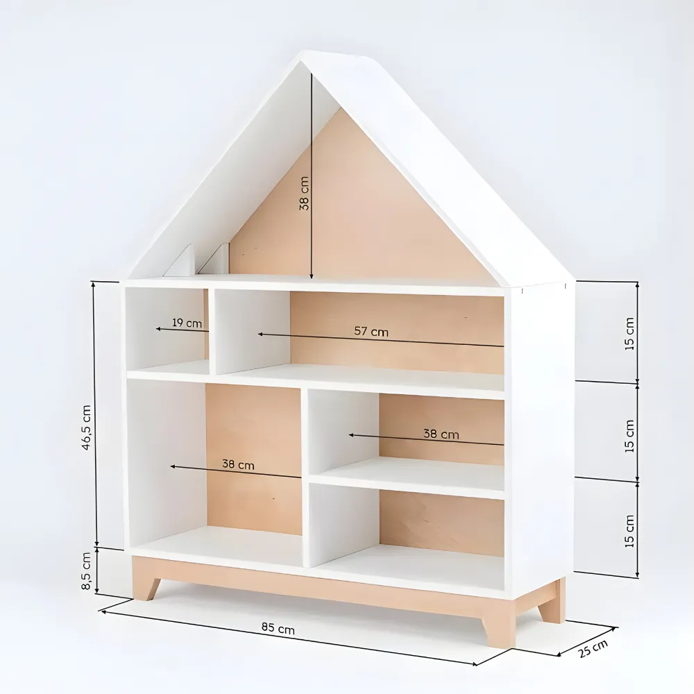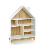 Este mueble diseñado para la organización y exhibición de objetos en espacios infantiles. Presenta una estructura en forma de casa de tamaño pequeño que permiten a los niños acceder fácilmente a sus libros y juguetes, fomentando su autonomía y el orden.