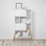 Su base inclinada con patas agrega estabilidad y un toque decorativo distintivo. Gracias a su diseño compacto y estilizado, se adapta a diferentes espacios, proporcionando almacenamiento práctico sin ocupar demasiado lugar. Es una opción perfecta para fomentar la organización de manera accesible y atractiva para los más pequeños.
