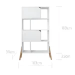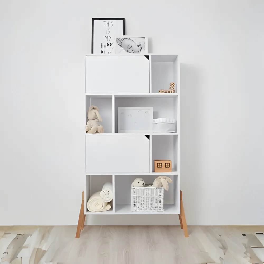 Este mueble infantil destaca por su diseño moderno y funcional, ideal para organizar juguetes, libros y objetos decorativos en la habitación de los niños. Cuenta con una estructura de estantería abierta con compartimentos de distintos tamaños, permitiendo una distribución versátil de los elementos. Incluye dos puertas abatibles que ayudan a mantener el orden y ocultan objetos menos utilizados.