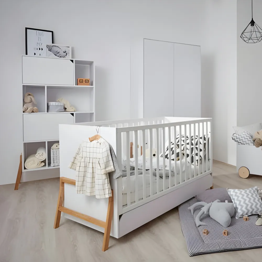 El diseño general de la mesita es minimalista y funcional, adaptándose a diferentes estilos de decoración infantil. Su combinación de colores suaves y su tirador en forma de corazón crean un ambiente cálido y acogedor en la habitación de la niña.