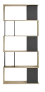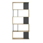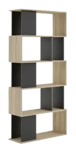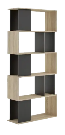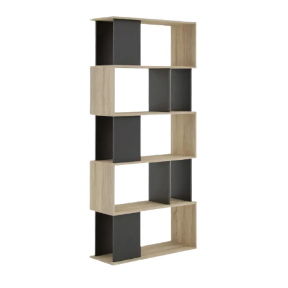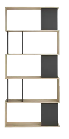 Estante decorativo a base de melamina de 18 mm de espesor con canto delgado en la estructura y canto grueso de 3 mm. Diseño geométrico en madera clara y negro, ideal para dividir espacios y exhibir decoraciones con estilo contemporáneo.