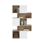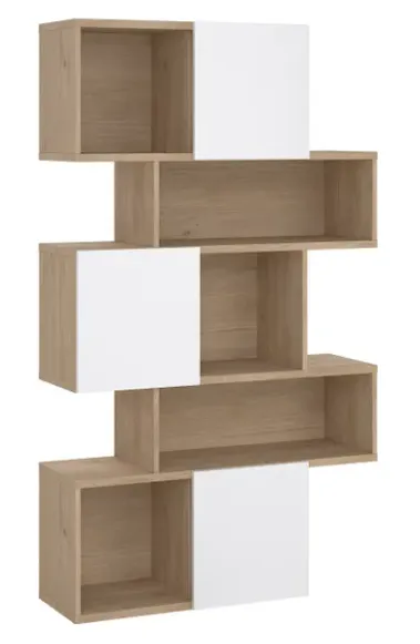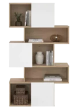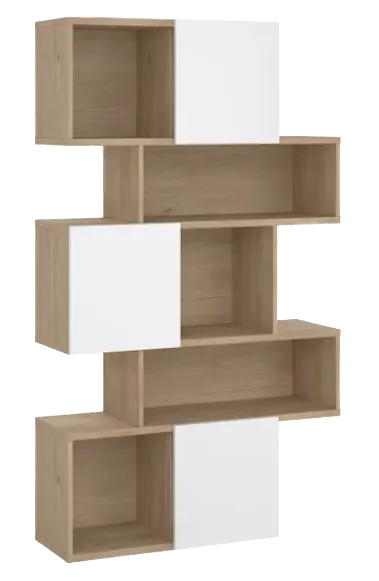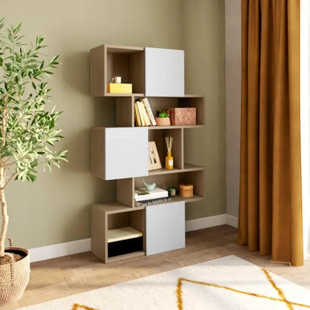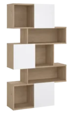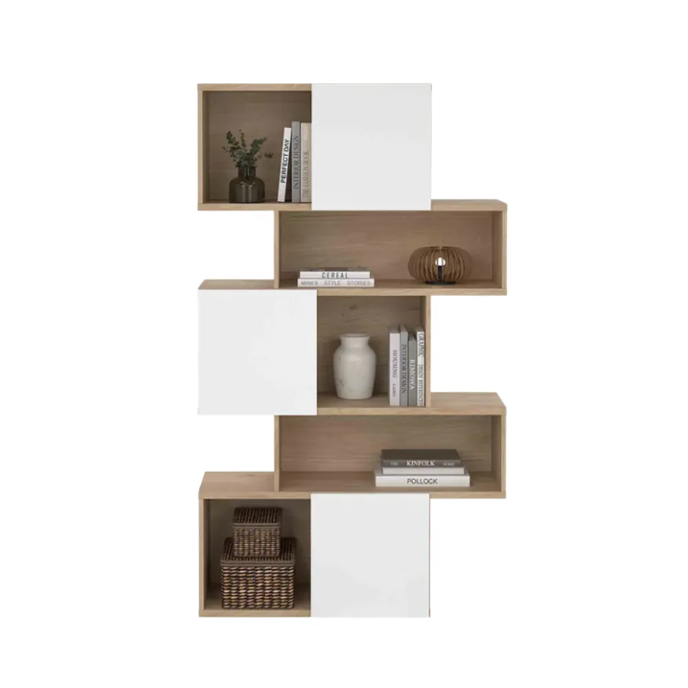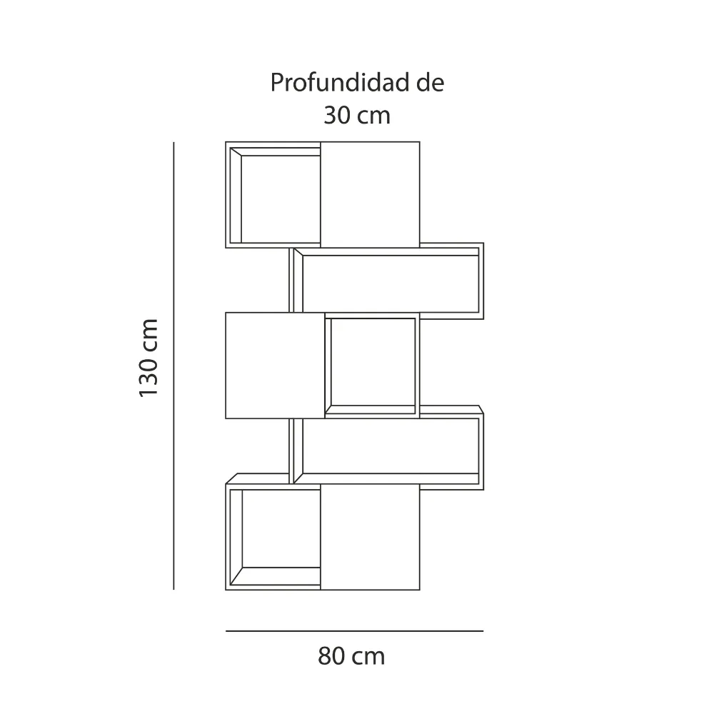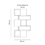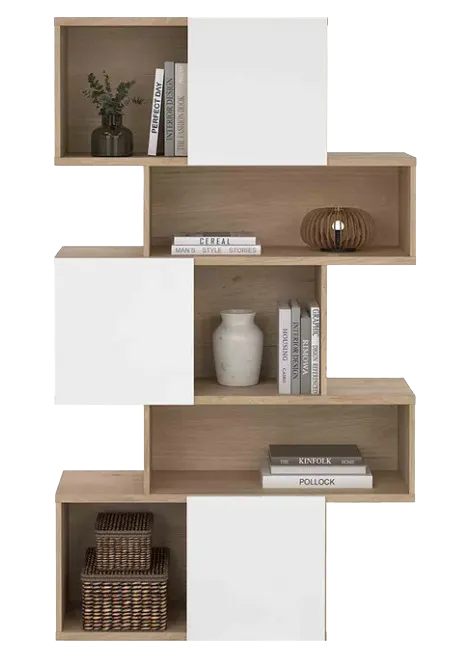 Estante decorativo a base de melamina de 18 mm de espesor con canto delgado en la estructura y canto grueso de 3 mm. Combina compartimientos abiertos y cerrados, perfecto para organizar y decorar con estilo.
